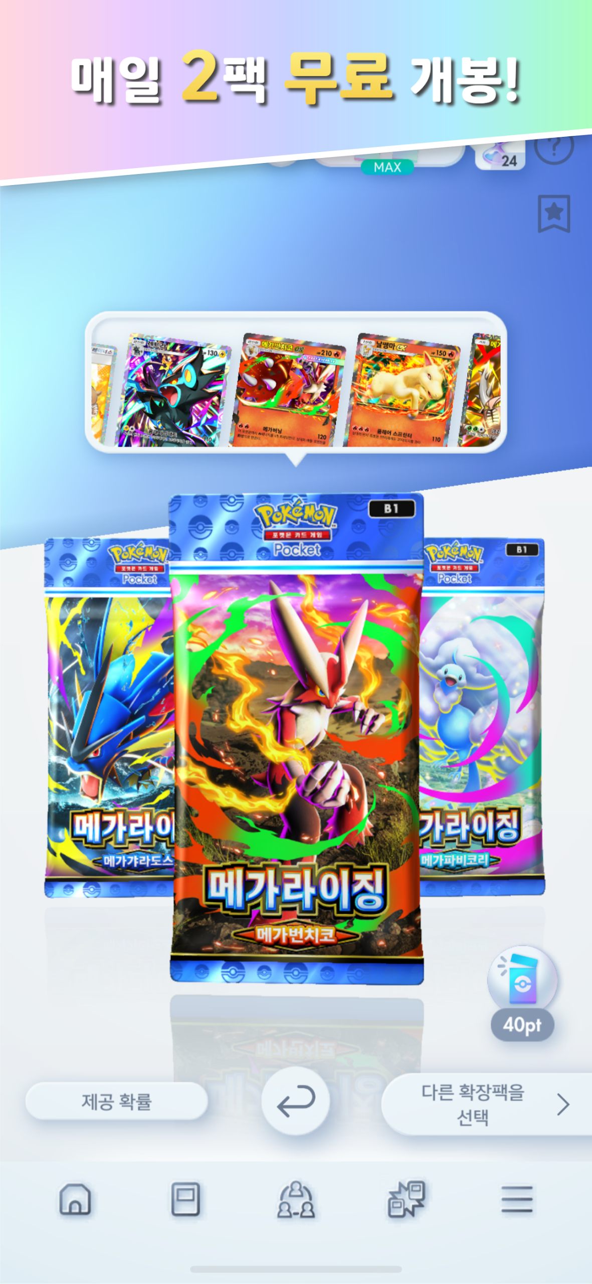 - 매일 새로운 카드 팩 개봉: 매일 무료로 제공되는 카드 팩을 개봉하며 새로운 포켓몬 카드들을 수집하는 즐거움을 선사합니다.